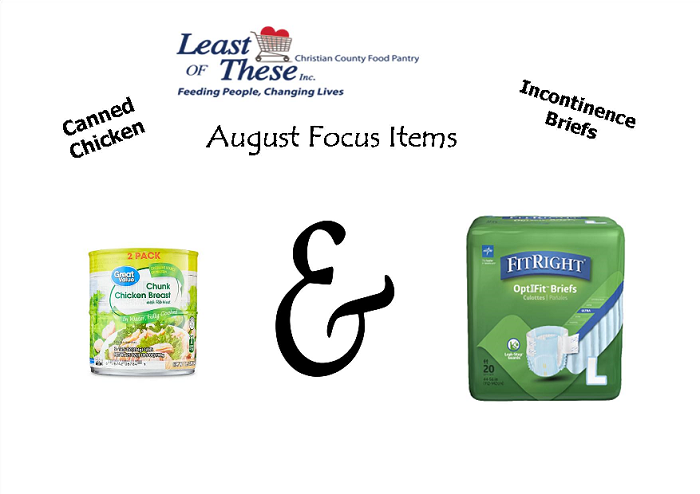 The August focus items for the Least of These is canned chicken and incontinence briefs. Pick up some of these items while out shopping and place them in the red trunk outside the Worship Center.