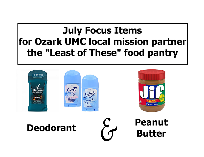 The Focus Items for the Least of These Food Pantry are Peanut Butter and Deodorant. Grab some of the items while you are doing your shopping and bring them to the red trunk in the main hallway.