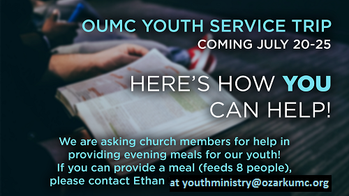 Our OUMC Youth service trip is coming up July 20 – 25 and we are asking the church for help in providing evening meals. As we will be staying at the church for that week, we plan to […]