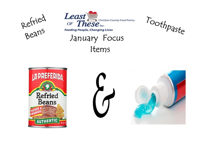 The January focus items for the Least of These are Refried Beans & Toothpaste. Pick up these items while you are out shopping and place them in the red trunk outside the Worship Center.