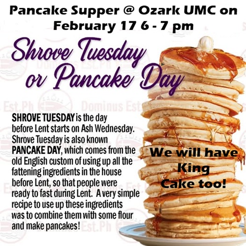 Pancake Dinner served 6 pm – 7 pm on Tuesday, February 17 at Ozark UMC.