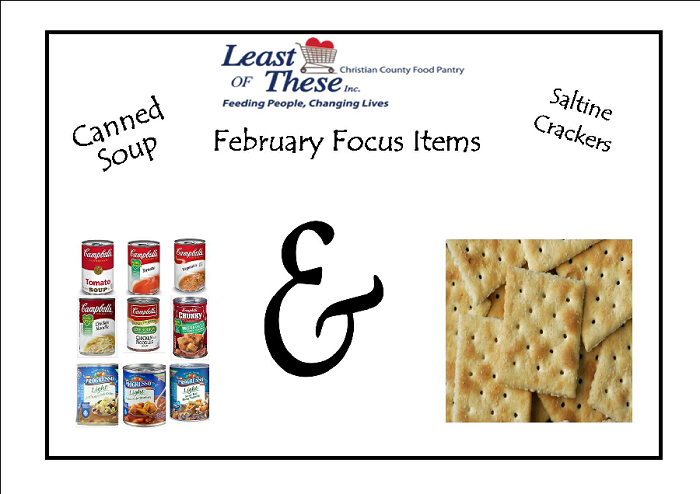 The February focus items for our ministry partner Least of These will be crackers and canned soups. Pick up some while you are out shopping and place in the red trunk in the main hallway.