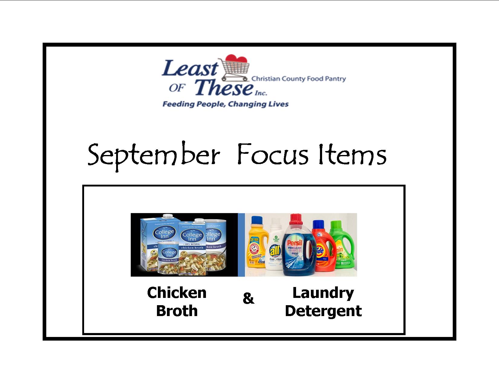 The focus items for the Least of These is Chicken Broth and Laundry Detergent.  Grab some of these items while you are out shopping and drop them off in the trunk near the Worship Center  entrance.